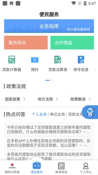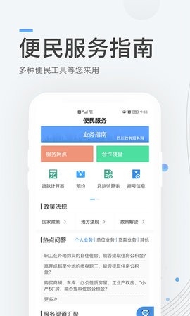 5、便民服务:新闻动态查看缴存地公积金中心的政策解读、业务指南和中心文件信息;并提供服务网点查询、房贷计算器等公积金服务。