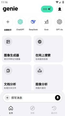 Genie是一款全新的智能AI软件,他整合了Deepseek、GPT-4等模型。可以解决用户的大多数问题,例如文档分析、图像生成、图像分析等功能,在这用户可以与AI进行流畅的对话,它不仅仅是一个聊天机器人,也是陪伴用户的智能管家,改善人们的日常生活。