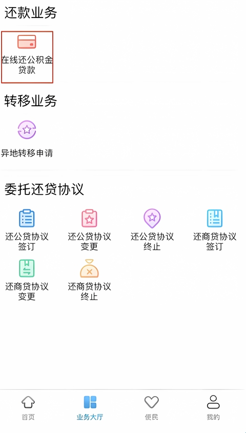 本模块包括在线归还公积金贷款,委托提取还公积金贷款协议签订、变更、终止,委托提取还商业贷款协议签订、变更和终止等功能。广大职工可随时随地在线直接办理提前还款、提前结清、冲还贷还款协议签约等业务。