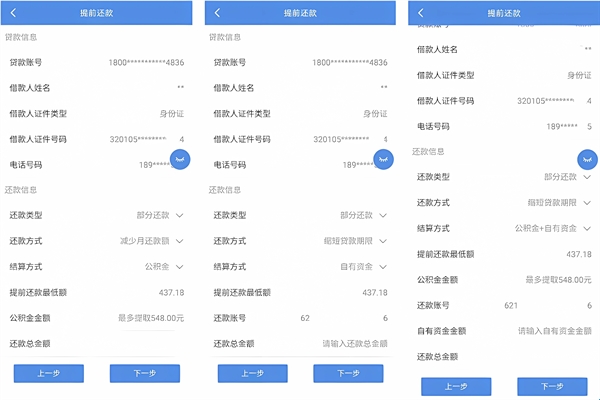 4、若您还款类型选择【部分还款】,您需要先选择还款方式:【减少月还款额】或者【缩短贷款期限】,然后选择结算方式,如果您选择【公积金】结算,在公积金金额栏输入提前还款金额,确认还款信息无误后,可点击【下一步】;如果您选择【自有资金】结算,需要确认还款账号是否正确,然后在还款总金额栏输入提前还款金额,确认还款信息无误后,可点击【下一步】;如果您选择【公积金+自有资金】结算,您需要在公积金金额栏和自有资金金额栏分别输入提前还款金额,还款总金额自动计算。确认还款账号是否正确并确认还款信息无误后,可点击【下一步】。