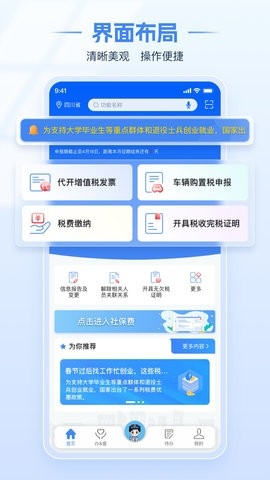电子税务局是国家税务总局推出的税务软件,软件拥有纳税申报、证明开具、发票代开、账户管理等等税务功能,为用户给予更方便更智慧的税务服务体验,用户可以通过它实时查询税务信息,随时了解自己的税务状况。