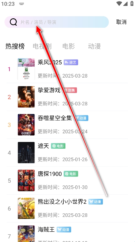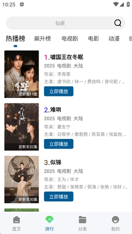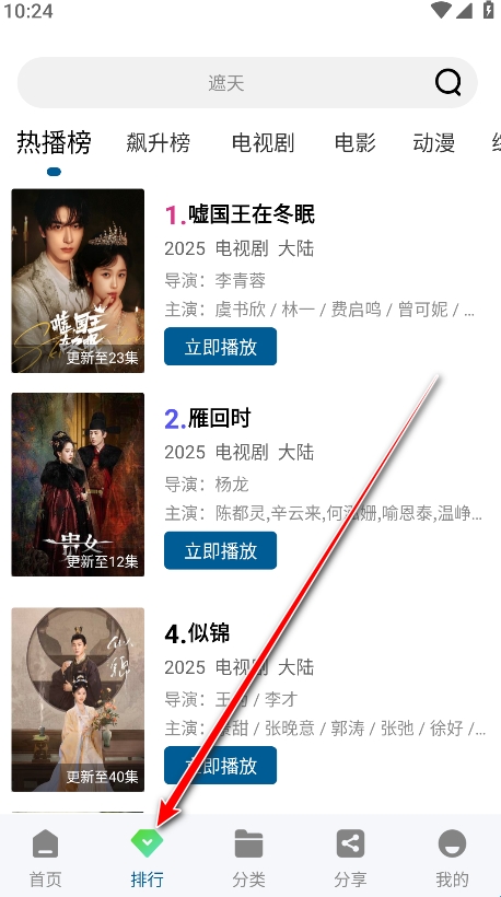 4、点击下方的排行,即可看到热播榜、飙升榜、电视剧、电影的榜单剧。