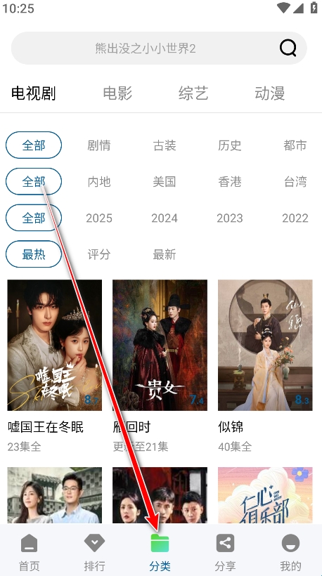 5、点击分类,即可看到根据区域、时间、评分等划分的剧,大家可以根据自己的喜好来选择观看哈。