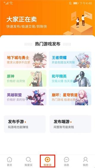 4、在【我要卖】界面,用户可以选择发布手游或者端游的账号信息进行出售,