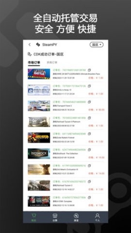 SteamPY:百万Steam玩家首选的专业游戏交易平台。用户可以在这里找到很多的游戏资源,热门游戏、畅销游戏,你喜欢的游戏都可以在这里找到资源下载,并且,软件中还可以出售自己的Steam余额,也能够低价购买到喜欢的游戏,代购订单发布之后,一键全程托管,完全不需要操心。