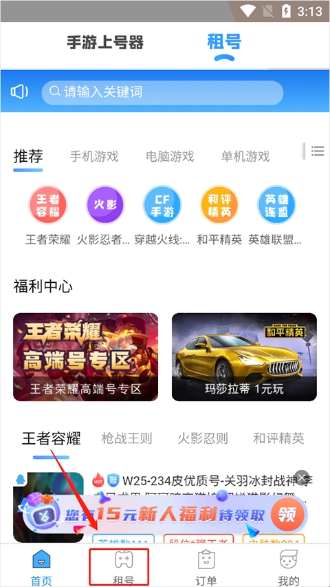 1、进入应用之后选择“租号”。