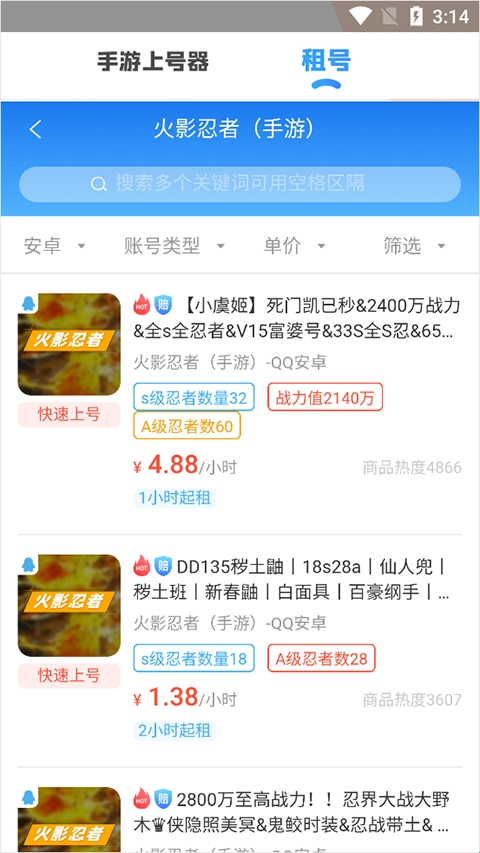手游租号上号器:非常好用的安卓端租号服务软件。软件中汇聚了当前的各种类型的手游账号,用户之间可以在线进行交易,在平台内可以进行租号交易,也能够直接一键上号,保护了玩家账号的安全,用户可以享受到低价的租号体验、优质的账号选择,快来下载选择自己喜欢的游戏账号吧。
