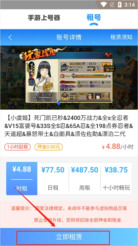 4、选择租赁的游戏时间,点击立即租用就可以了。