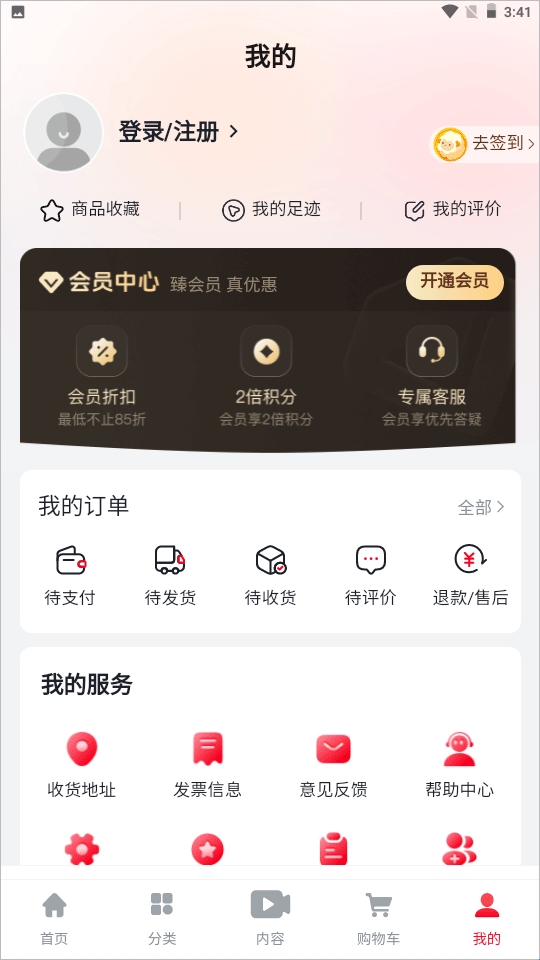 1、在本站下载安装好小杨臻选app,运行软件,可以看到有首页、分类、内容、购物车、我的五个板块;