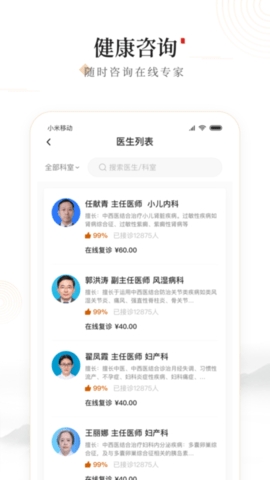7、全科科室:应用内设有所有健康科室的在线接诊工作,医生均为各个科室的专家。