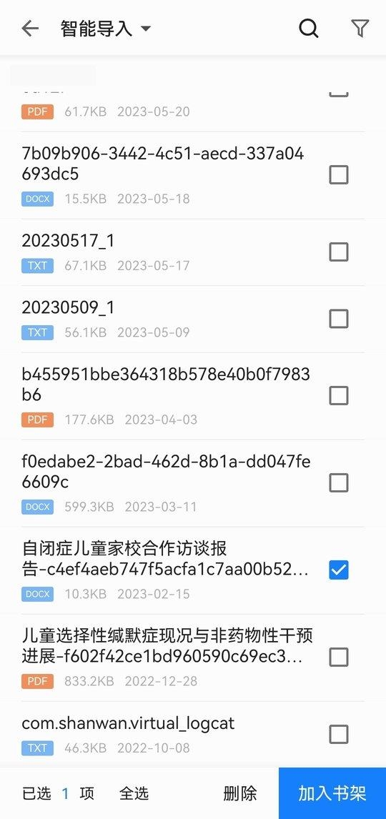 4、软件会智能识别出你手机里的DOCX、TXT和PDF等文件,点击你想要导入的内容,再点击右下方的【加入书架】。