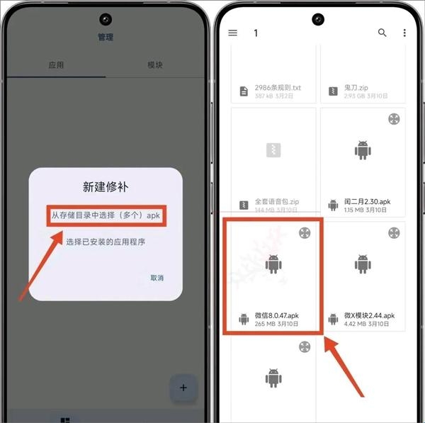 3、接着我们点右下角+号开始正式新建修补(内置模块)。这里有两个选项。我们先以从存储目录中选择为例,后面在以选择已安装的应用程序为例