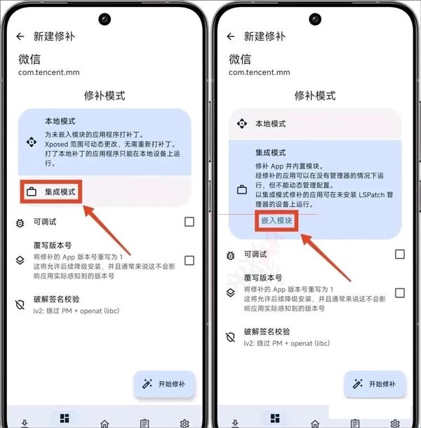 4、【从存储目录中选择】→从存储目录中选择apk→选择已经下载好需要内置的应用apk文件→集成模式→嵌入模块→选择已经下载好的模块apk文件→开始修补→等待底部出现返货安装的按钮,即修补内置完成
