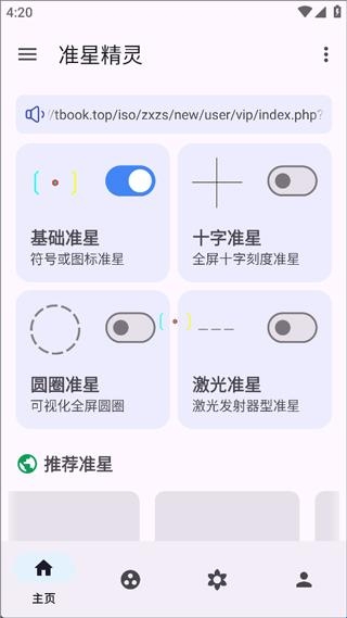 1、进入到软件的主页面,可以看到有很多准星类型,包括基础准星、十字准星、圆圈准星和激光准星,选择一个点后右侧按钮即可开启;