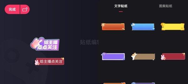 5、文字贴纸和图案贴纸两个可同时选择,并且支持移动位置。文字贴纸可以输入一些想说的句子与粉丝互动。设置完成后点击右上角的【完成】就能保存并退出了。