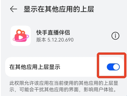 3、找到快手直播伴侣,开启在【在其他应用上层显示】这个权限。