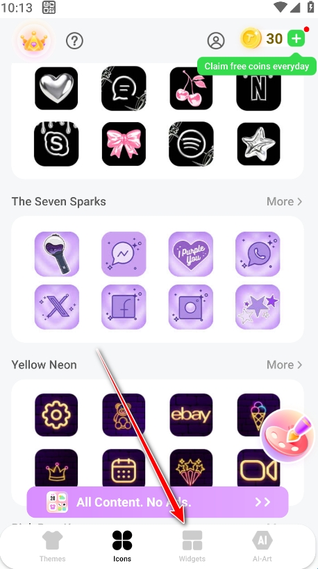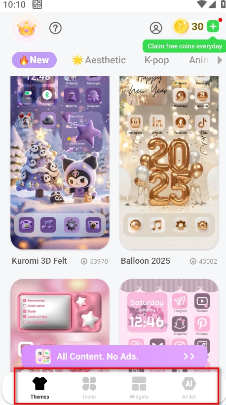 1、打开Themepack,可以看到有四大板块内容,依次是主题、图标、小工具、ai艺术创作。