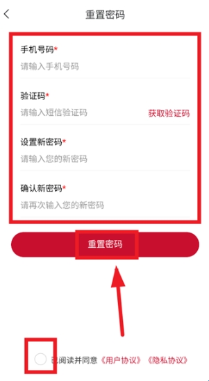 输入手机号,验证码,设置新密码,确认新密码,勾选已阅读并同意《用户协议》《隐私协议》,点击重置密码即可。