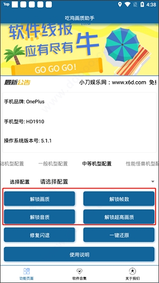 5、吃鸡极限帧率修改、吃鸡高画质修改、吃鸡优化等功能全都有,界面清爽,功能实用。