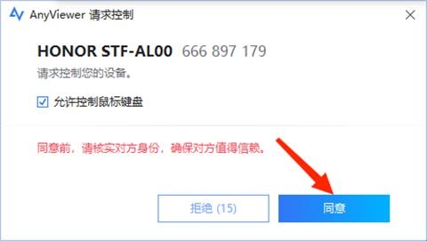 4、此时,在电脑端Anyviewer会弹出请求控制的提示,选择【同意】,