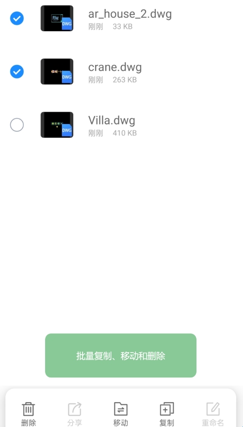 6、在文件列表编辑界面中,可进行单个或批量文件的管理。可进行多个文件删除、移动、复制;仅单个文件支持分享或重命名。
