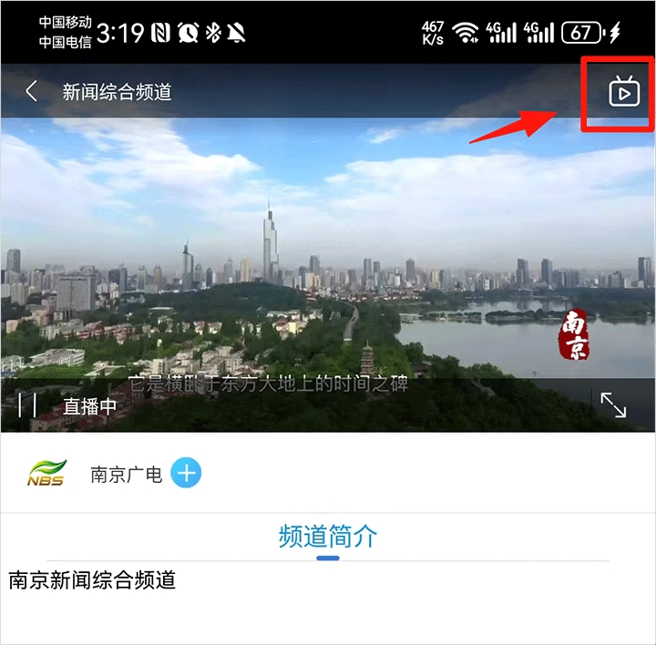 3、进入播放界面后轻触屏幕唤醒菜单并点击右上角电视图标