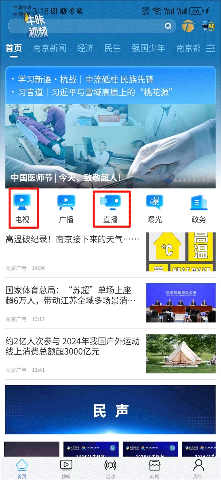 1、首先将手机与电视连接至同一网络,然后在app首页点击电视或直播功能