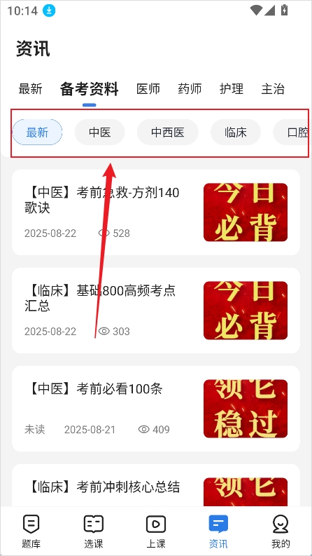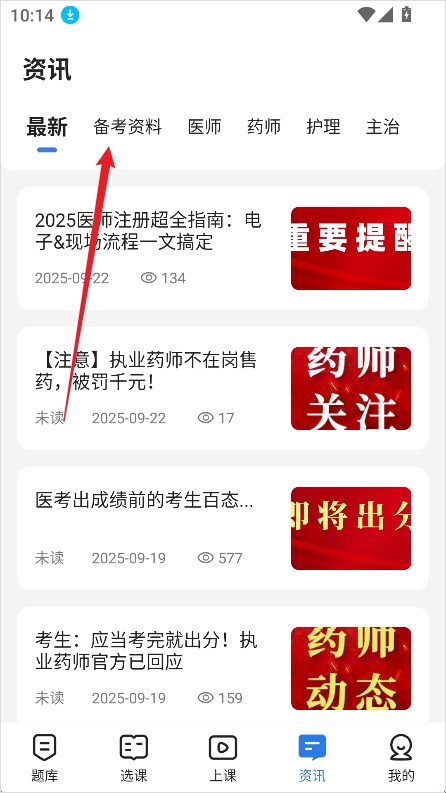 2、在资讯页面中,选择【备考资料】。