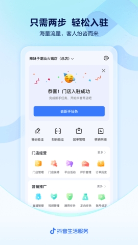 抖音来客是一款专为抖音本地生活商家推出的服务平台。软件提供门店信息管理、团购上架、营销推广和经营结算等全面功能,能够帮助商家更好的管理店铺,通过关联抖音账号,商家可以实现直播、短视频带货,通过流量加持推送商品,提高店铺曝光率和客源。