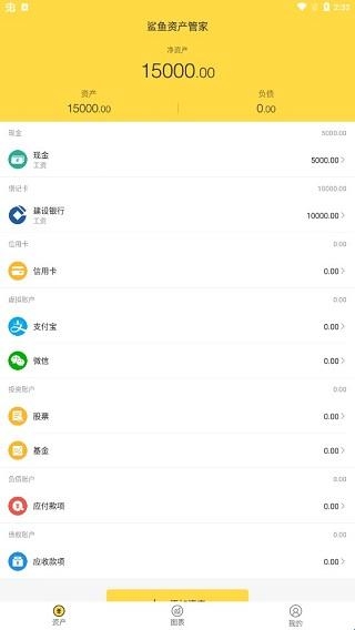 1、进入软件界面,整个风格同《鲨鱼记账》一样,非常的简约!资产、图表和我的,除此之外别无其他,在资产中用户可以对现金、借记卡、信用卡、虚拟账户(支付宝、微信)以及投资账户的股票、基金进行设置,通过以上的操作,鲨鱼资产管家将详细为你展示净资产数额和负债的情况。