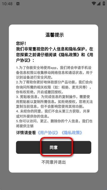 1、下载安装好软件后,打开先要查看用户隐私协议。