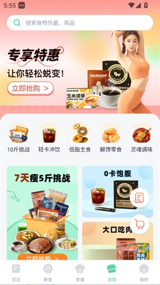 推出减肥相关食品特惠,分类展示轻卡冲饮、低脂主食等商品