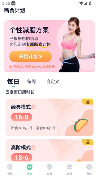 提供个性减脂断食方案,有每日不同断食模式可选
