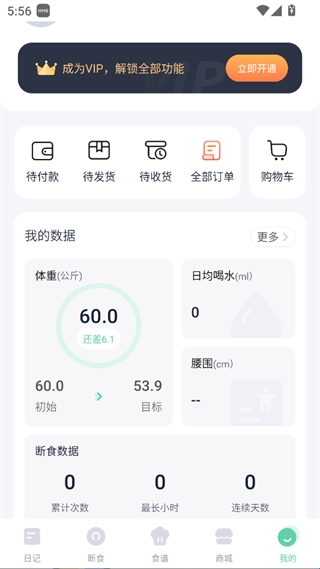 可管理订单,查看体重、喝水等数据及断食记录,能开通VIP解锁全部功能