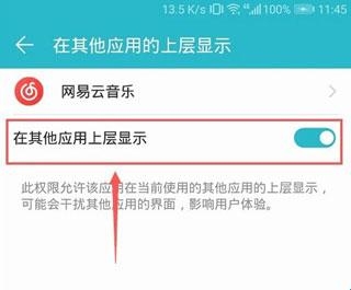 6、然后把页面里的在其他应用的上层显示开启即可。