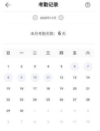 3、点击考勤查询功能,选择需要查询考勤记录的工程名称,进入考勤日历页,可以查看工人在工程中进行考勤的天数及详细的出勤记录;