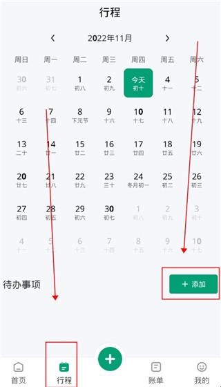 3、我们点击行程,在这里点击添加,可以将我们后续重要的事情记录在其中,到时间后软件会自动提醒你
