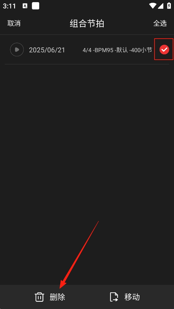 2、进入【组合节拍】界面后,可以看到自己已经添加的节拍,点击【选择】