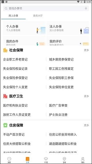 4、在“办事”的服务功能里,你可以根据自身的需求进行选择,是个人办事、法人办事,还是了解社会保障、医疗卫生情况,都可以在这里进行办理相关业务;