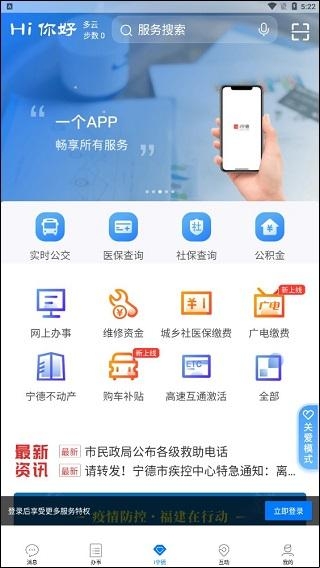 3、登录成功后,在“i宁德”支持实时公交查询、医保查询、社保查询和公积金查询,其下还包括网上办事,维修资金、城乡社医保缴费、广电缴费、宁德不动产、购车补贴、高速互通激活等等;