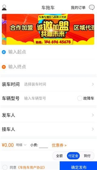 2、车拖车支持用户在线自行输入起点和终点,方便能及时得到服务;