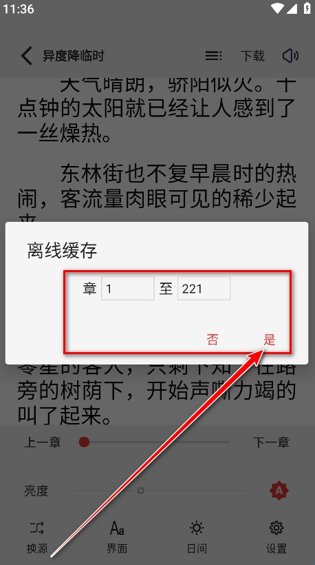 4、输入我们想要离线缓存的起始章节和最终章节,然后点击是。