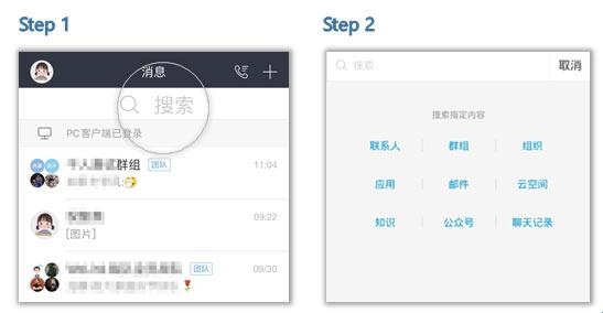 点击“搜索”,即可智能匹配出所有您想要的结果,如常用联系人、群组等信息。