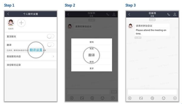 点击右上方的头像,设置好目标语言,长按消息即可翻译。