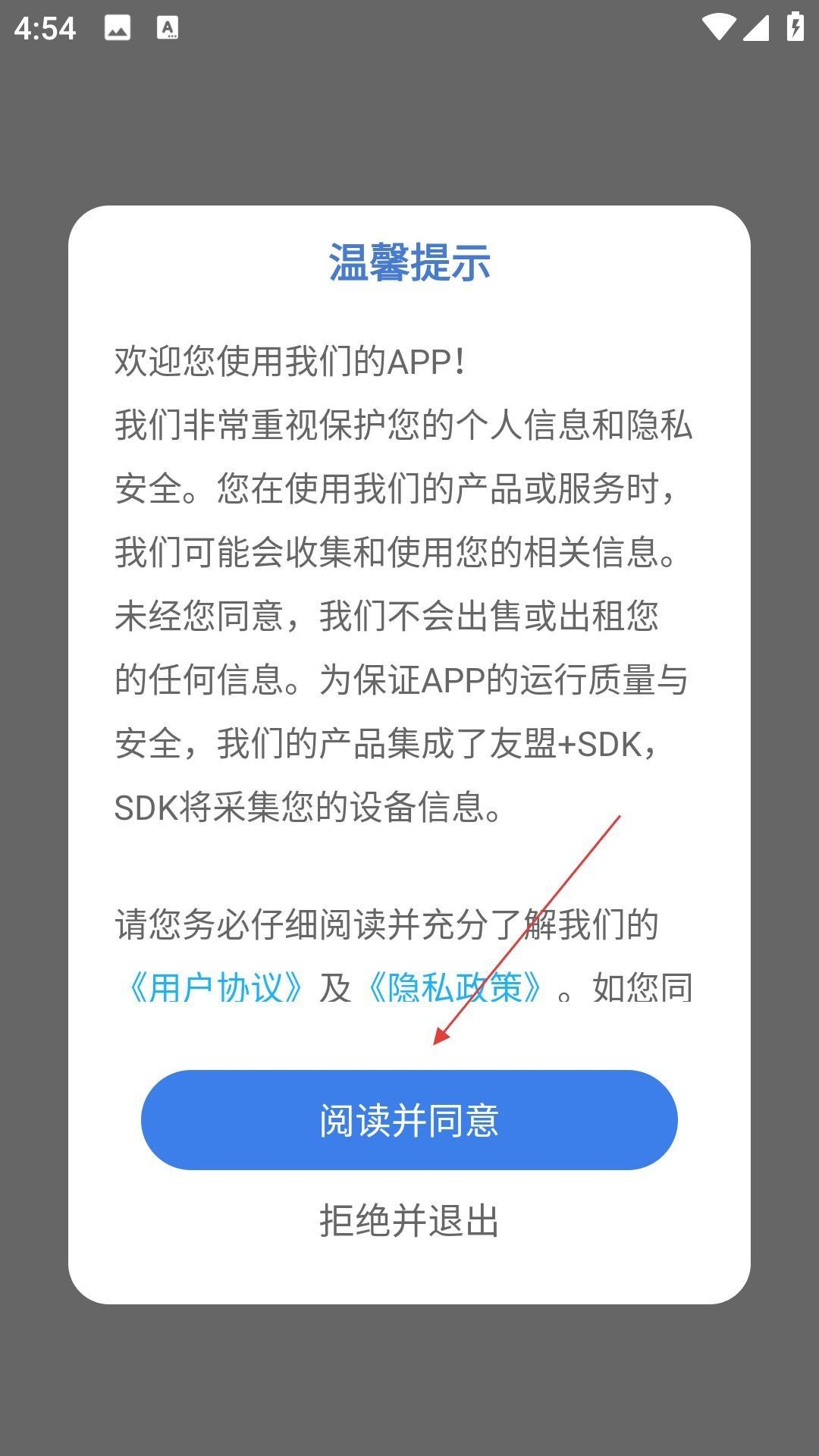 1、下载安装完成后进入,需在用户协议和隐私政策界面点击同意,接受相关条款后才能进入应用。
