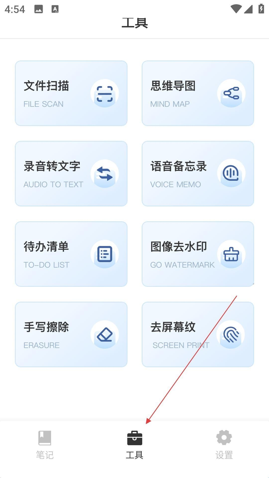 3、工具页面罗列文件扫描、思维导图等8个工具,涵盖文件处理、效率辅助等功能,方便用户使用各类实用工具。