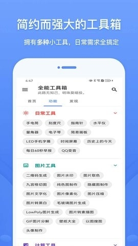 该APP提供了与文字、图片、设备、清理、文件、计算、查询、相关的多种工具,基本满足您在日常使用手机时的所有工具需求。