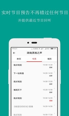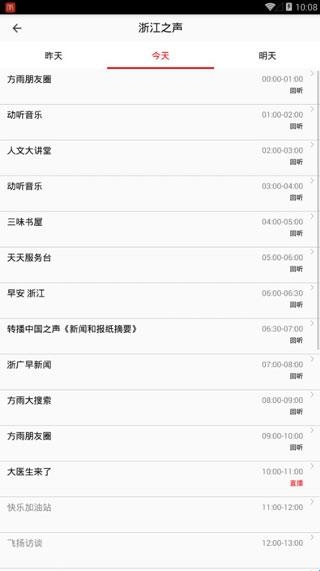 3、同时这里的电台还分为昨天、今天和明天记录,同时还有直播、回听等回放设定,从而让用户每天都有想要听的内容。