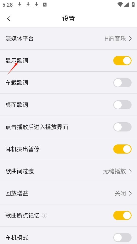 3、将显示歌词功能打开,播放音乐时就会显示歌词了