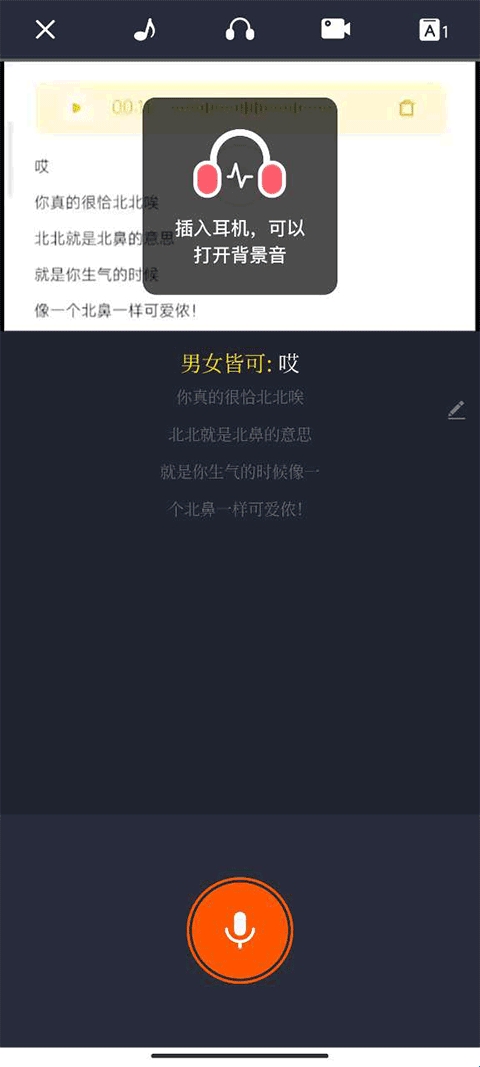 2、进入之后,带上耳机,点击下方的麦克风按键进行录音,完成录音后可以点击又上方的勾进行保存。
